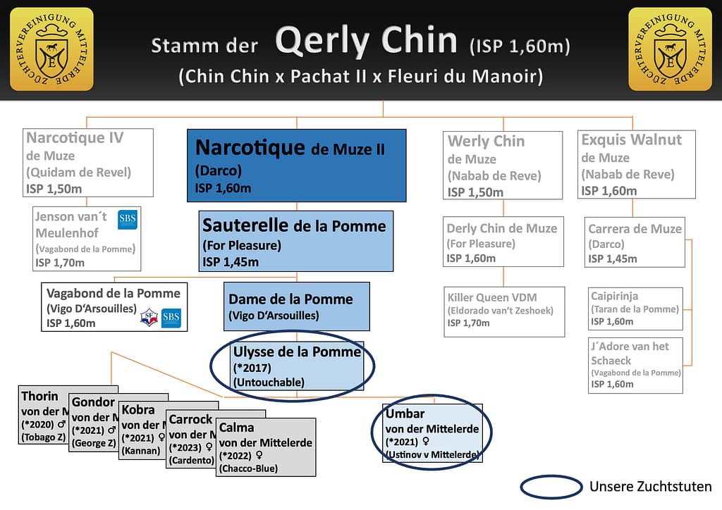 Die Erfolgsgeschichte der Narcotique de Muze II mit ihren Nachkommen beginnt bereits bei Großmutter Kerly und Mutter Qerly Chin, die beide schon auf höchstem Spring Niveau erfolgreich waren. Und züchterisch war es Qerly Chin die diesem Stamm ihre unvergleichliche Genetik mitgegeben hat.