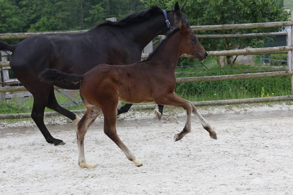Abstammung: Die belgische (BWP) Mutter Kayley DV hat 3 jährig ihre Stutenleistungsprüfung beim Hannoveraner Verband abgelegt und wurde anschließend behutsam in den Springsport gebracht. Hier war sie bis 1,35m erfolgreich bevor sie dann zurück in die Zucht ging. Denn auch für eine erfolgreiche Zucht sind die Voraussetzungen perfekt. Ihr Pedigree bietet alles was man für den erfolgreichen Springsport braucht. So war Vater Ustinov zum Beispiel Siegerhengst der KWPN-Hengstkörung 2004. Ihn zeichnen seine Spitzen-Galoppade sowie seine hervorragende Springtechnik aus, die er wiederum von seinem Vater, dem berühmten Achill-Libero H sowie Muttervater Nimmerdor geerbt hat. Kayley`s Mutter Anouska van de Fruitkorf, die selbst bis 1,60m im internationalen Springsport erfolgreich ist, führt ebenfalls das wertvolle Blut des Nimmerdor sowie weitere hocherfolgreiche Gene von Vererberlegenden wie zum Beispiel Furioso II, Gotthard und Der Löwe. Denn, sowohl ihr Vater Kannan als auch Muttervater Darco hatten über Jahre auf der WBFSH Rangliste der weltbesten Vererber einen Platz unter den Top 5 buchstäblich abonniert.
