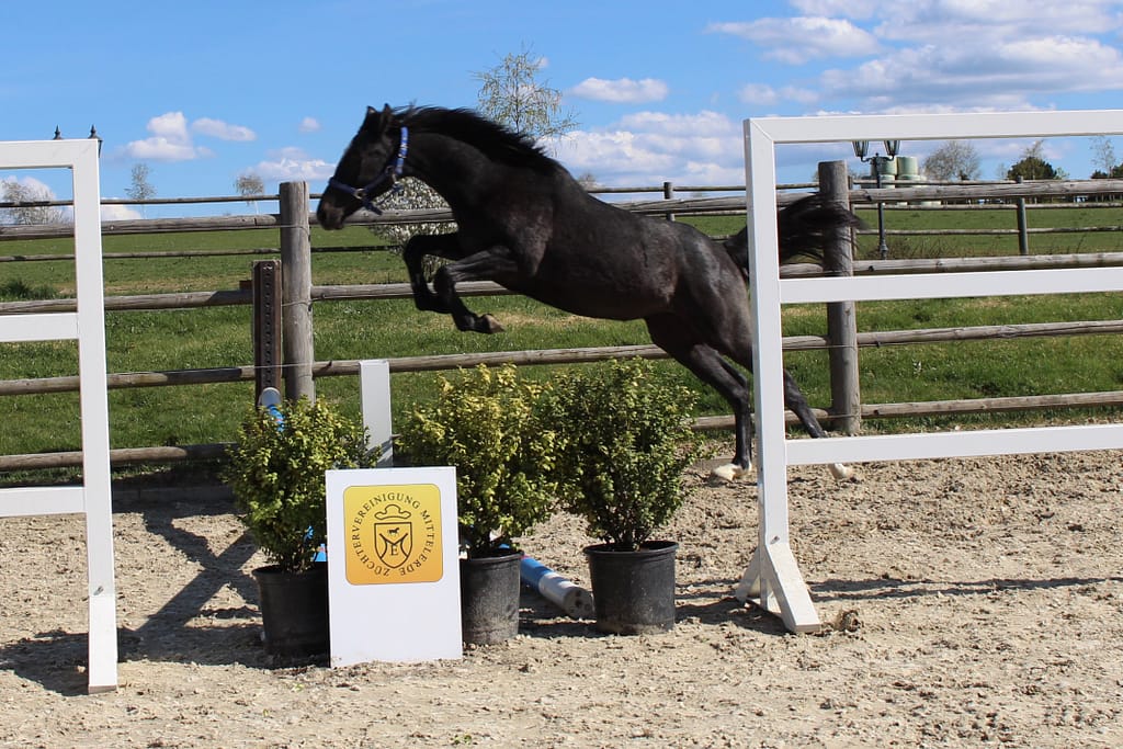 Beschreibung: präsentes, aufmerksames Fohlen, mit taktvoll schwebenden GGA – OS Fohlenprämie